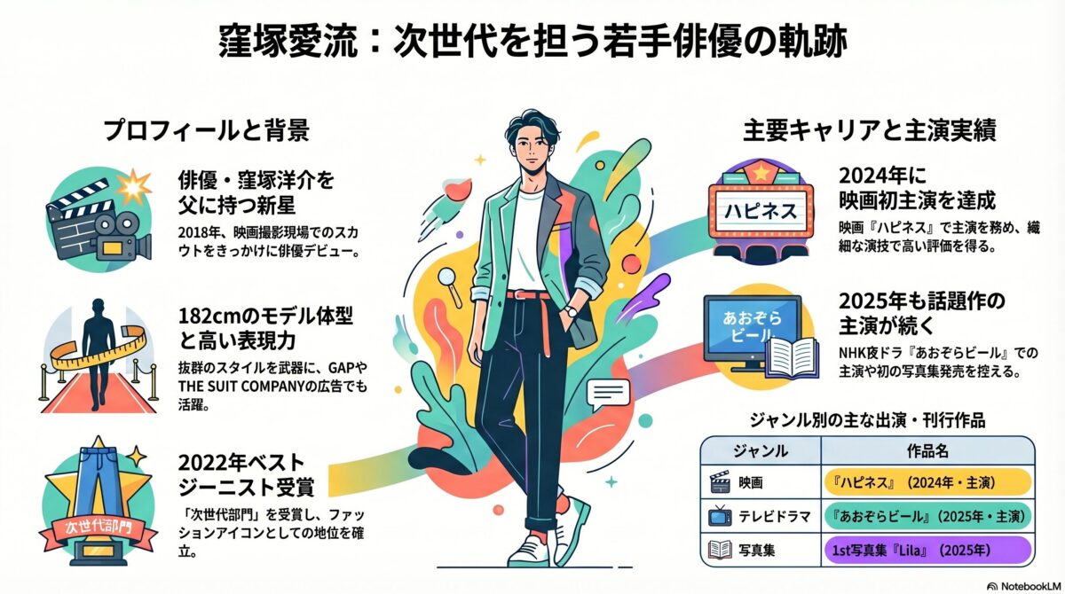 窪塚洋介の息子として知られながら、今や実力派俳優として独自の存在感を放つ窪塚愛流(くぼづか あいる)。2018年の映画デビューから着実にキャリアを積み上げ、2025〜2026年には主演ドラマ・映画が相次ぎ公開。今もっとも注目すべき若手俳優のひとりです。