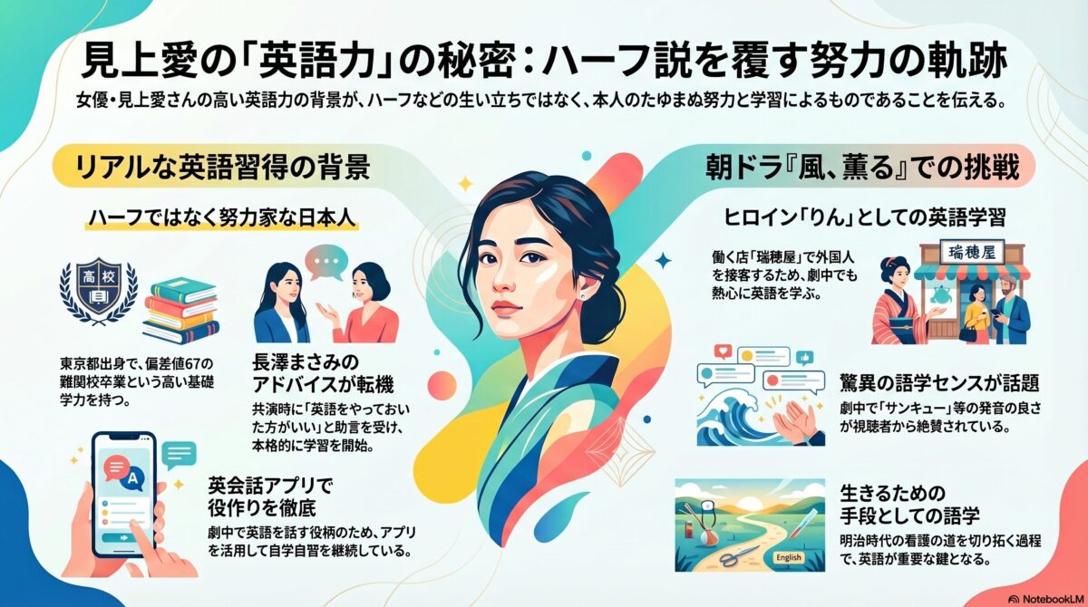 - 学習方法: 見上さんは英会話アプリなどを活用して熱心に勉強を続けています。特にドラマの役作り(『119エマージェンシーコール』や現在の『風、薫る』)において英語を多用するキャラクターを演じるため、ストイックに努力を重ねています。