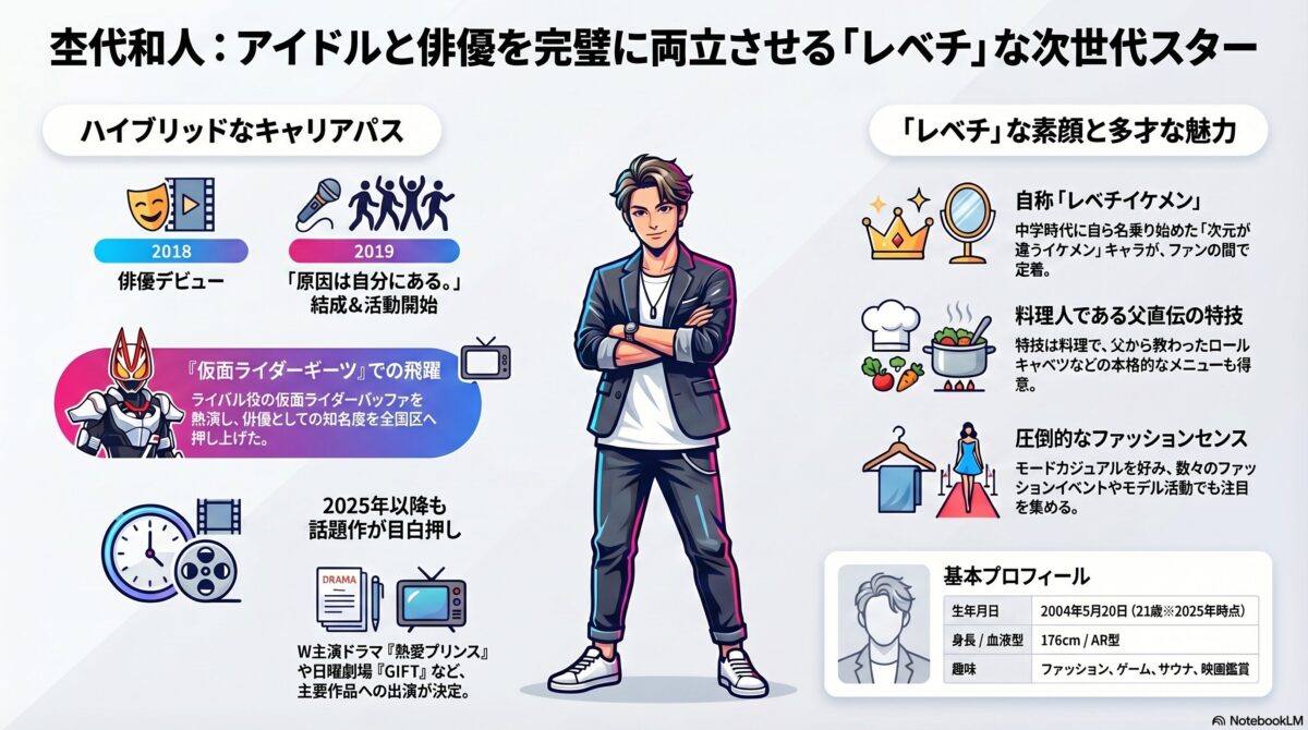 - 「アーティスト」と「俳優」の両立(二刀流): 北村匠海さんがダンスロックバンド「DISH//」のリーダーを務めながら俳優としても第一線で活躍しているのと同様に、杢代さんもボーカルダンスグループ「原因は自分にある。」のメンバーとして活動しながら、数々のドラマや映画に出演する俳優でもあります。