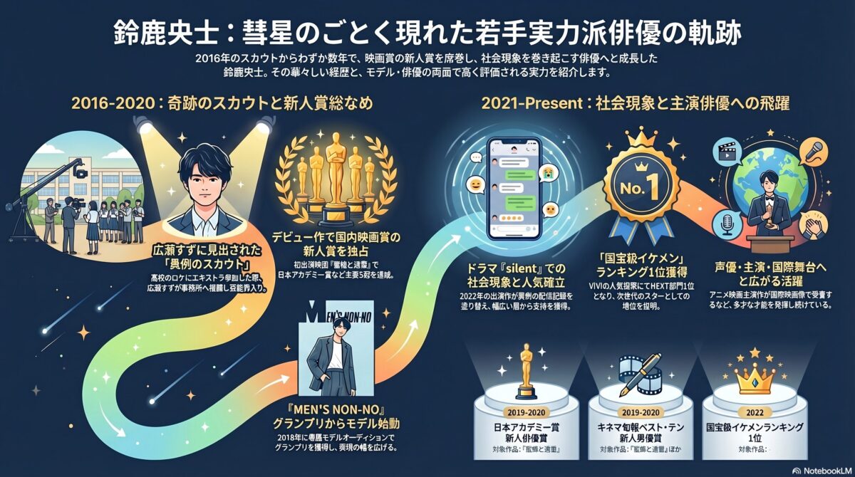 鈴鹿央士に関する詳細な経歴や、出演情報をまとめたプロフィールページです。彼は高校時代にエキストラとして参加した現場で、見出されたらしい。やっぱり、目立ちすぎていたのは理解できます。