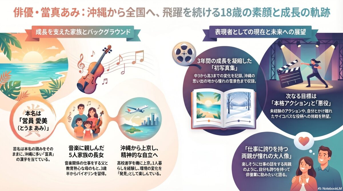 - 芸名の由来: 芸名の「當真(とうま)」は、本名の苗字「営員」の読み方はそのままに、漢字を簡略化したものです。